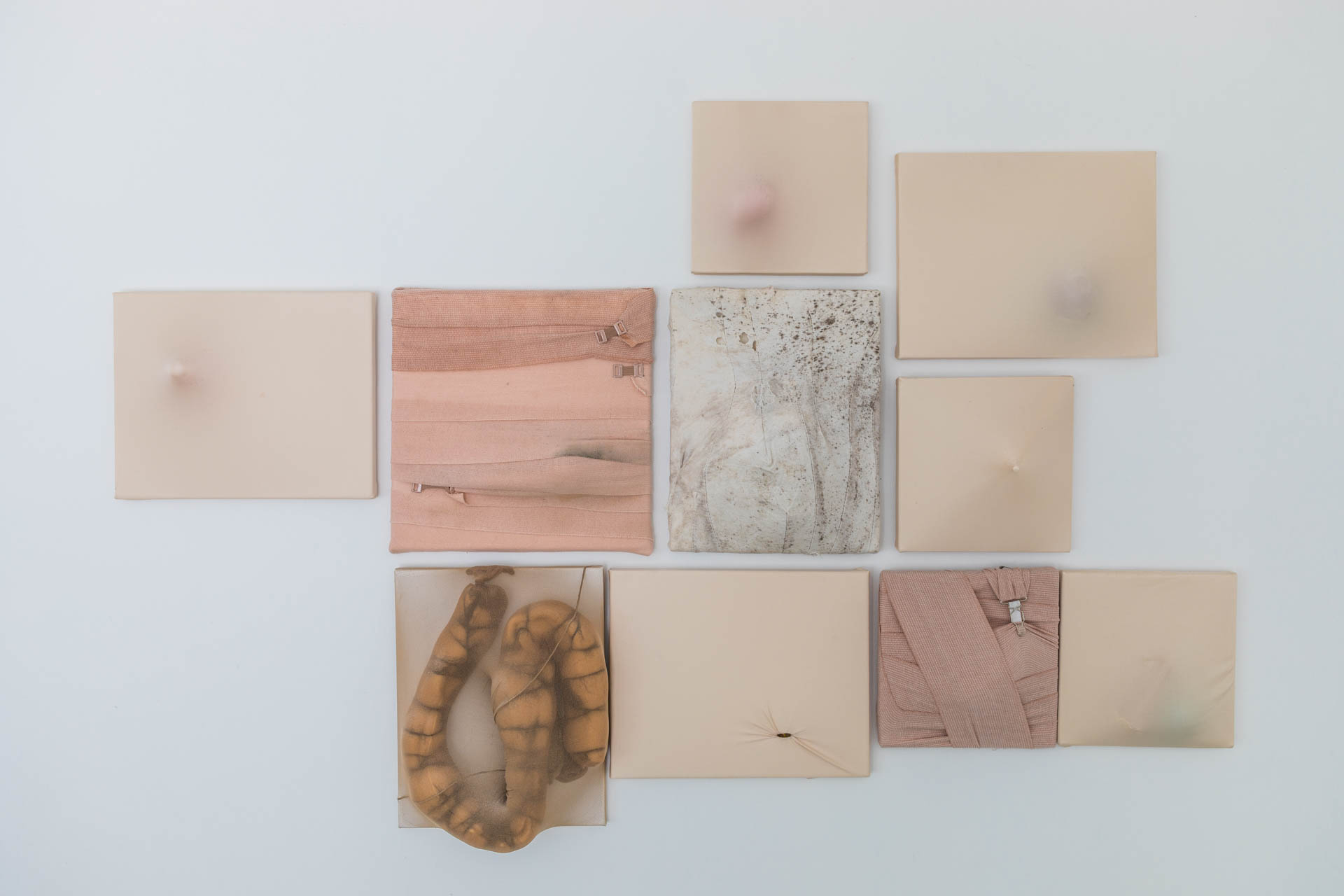 Tease me. 2011, mixed media, frames, lycra and cotton fabric, bandages, foam, different objects, 124 x 80 x 10 cm (Photo © www.felsch-foto)